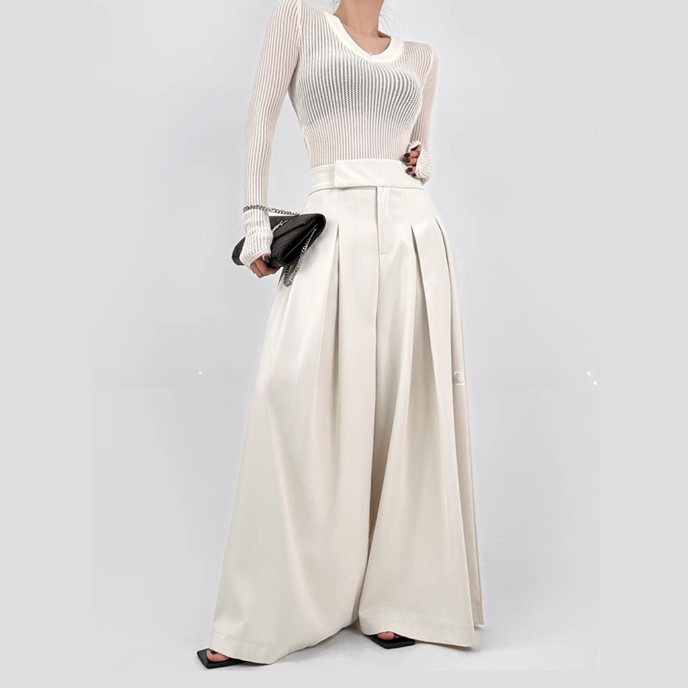 プリーツ仕立てでスカートの様なドレッシーさが美しい、都会的なムードを漂わせるエレガンスフレアスラックス。