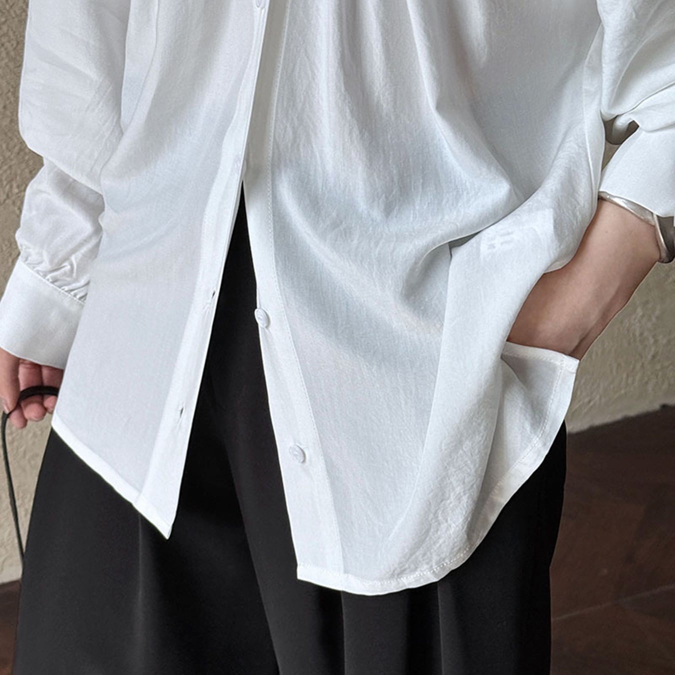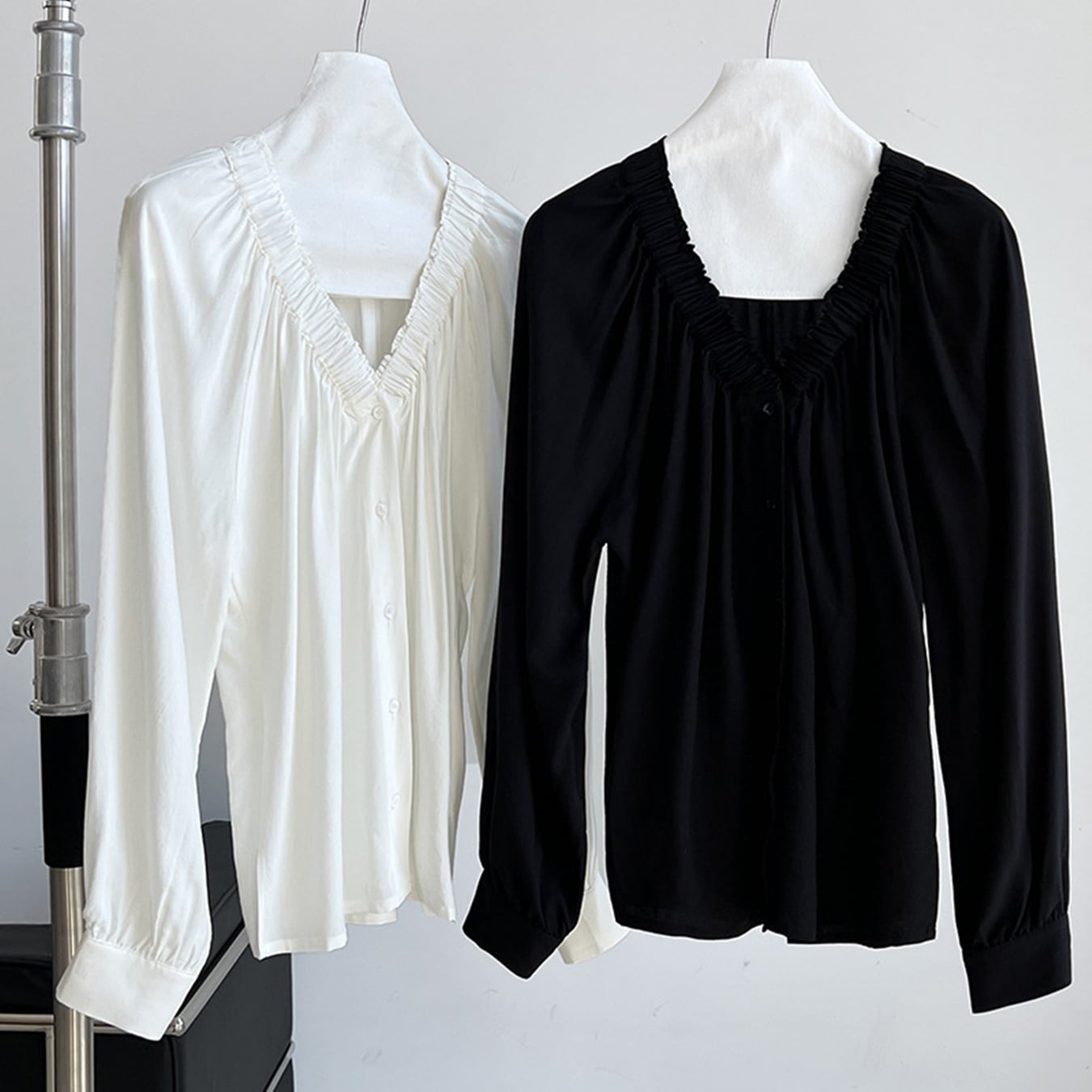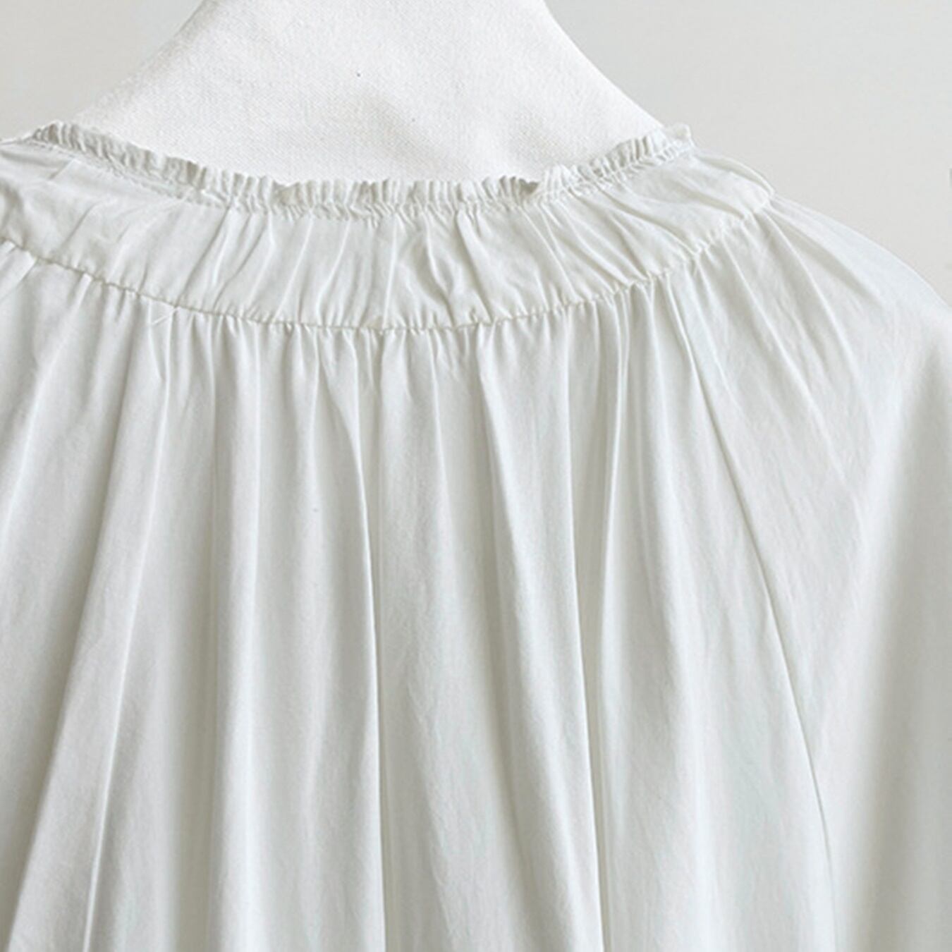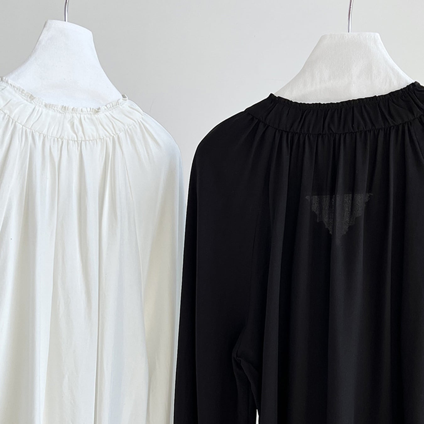 襟元に寄せた細やかなギャザーが、控えめながらも上品なニュアンスを添えるデザインブラウス。