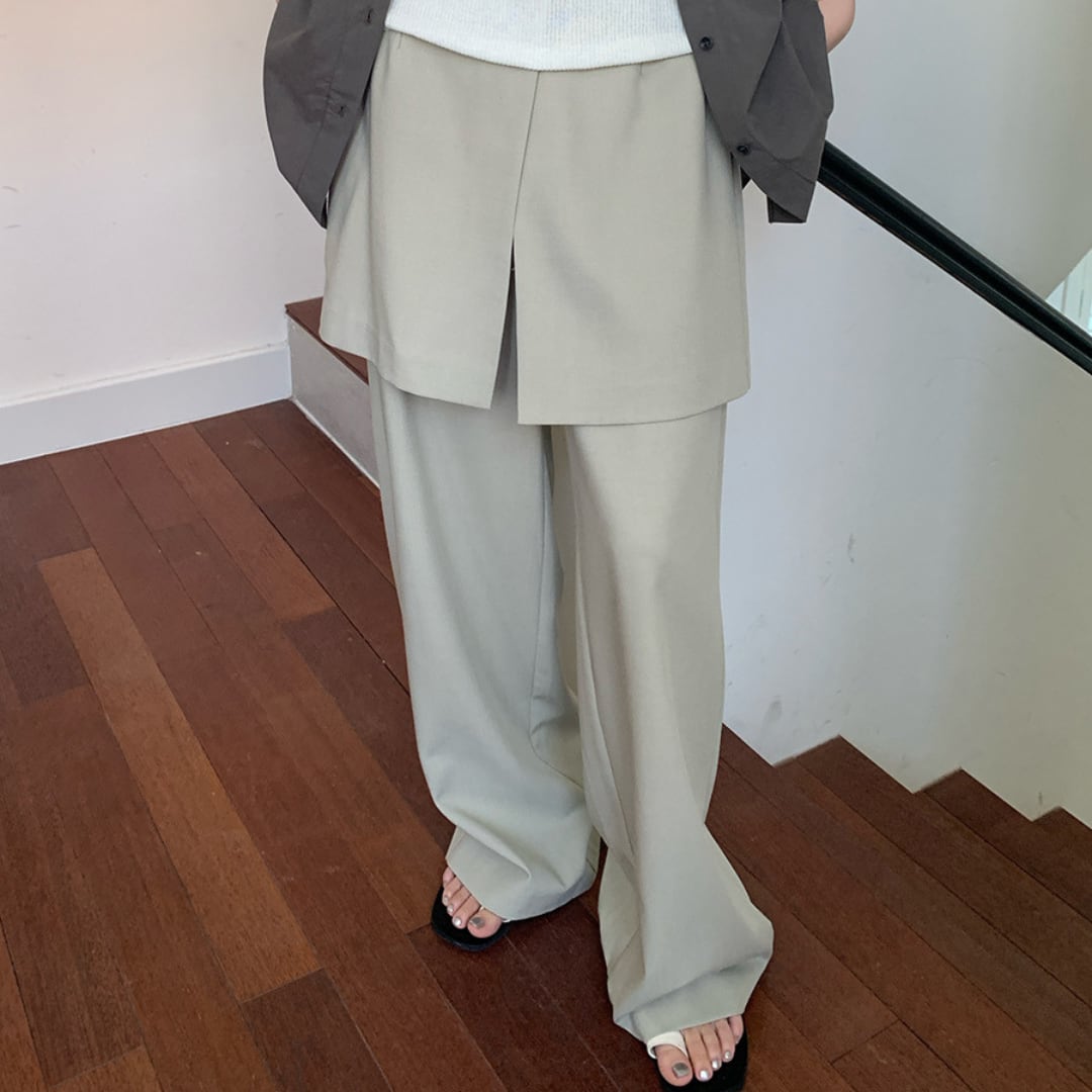 パンツの上にスカートを重ねたようなレイヤードデザインが目を惹く一着。