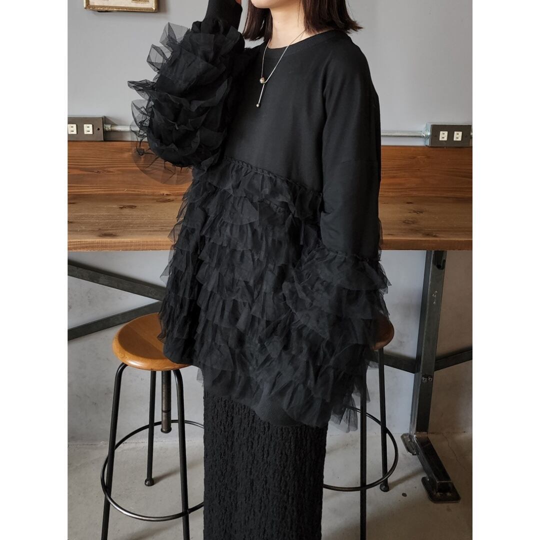 袖とウエスト部分にたくさんのチュールフリルを施したトップス。