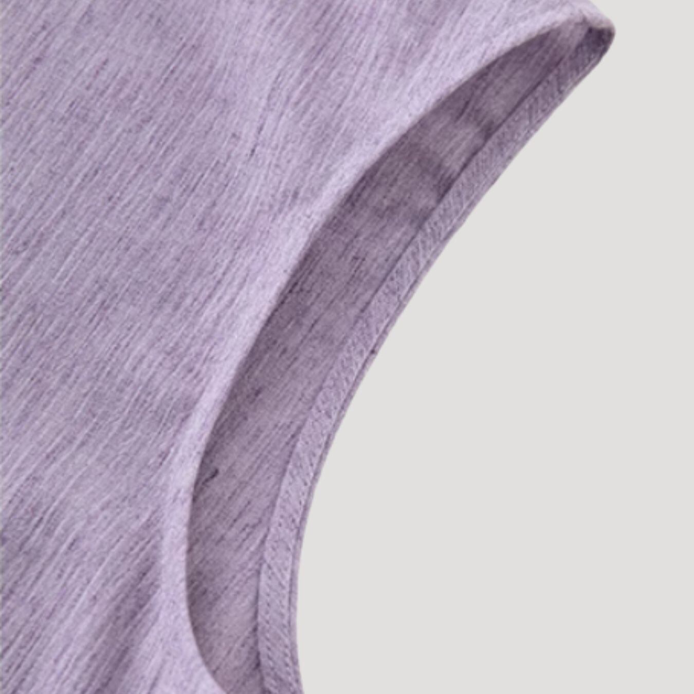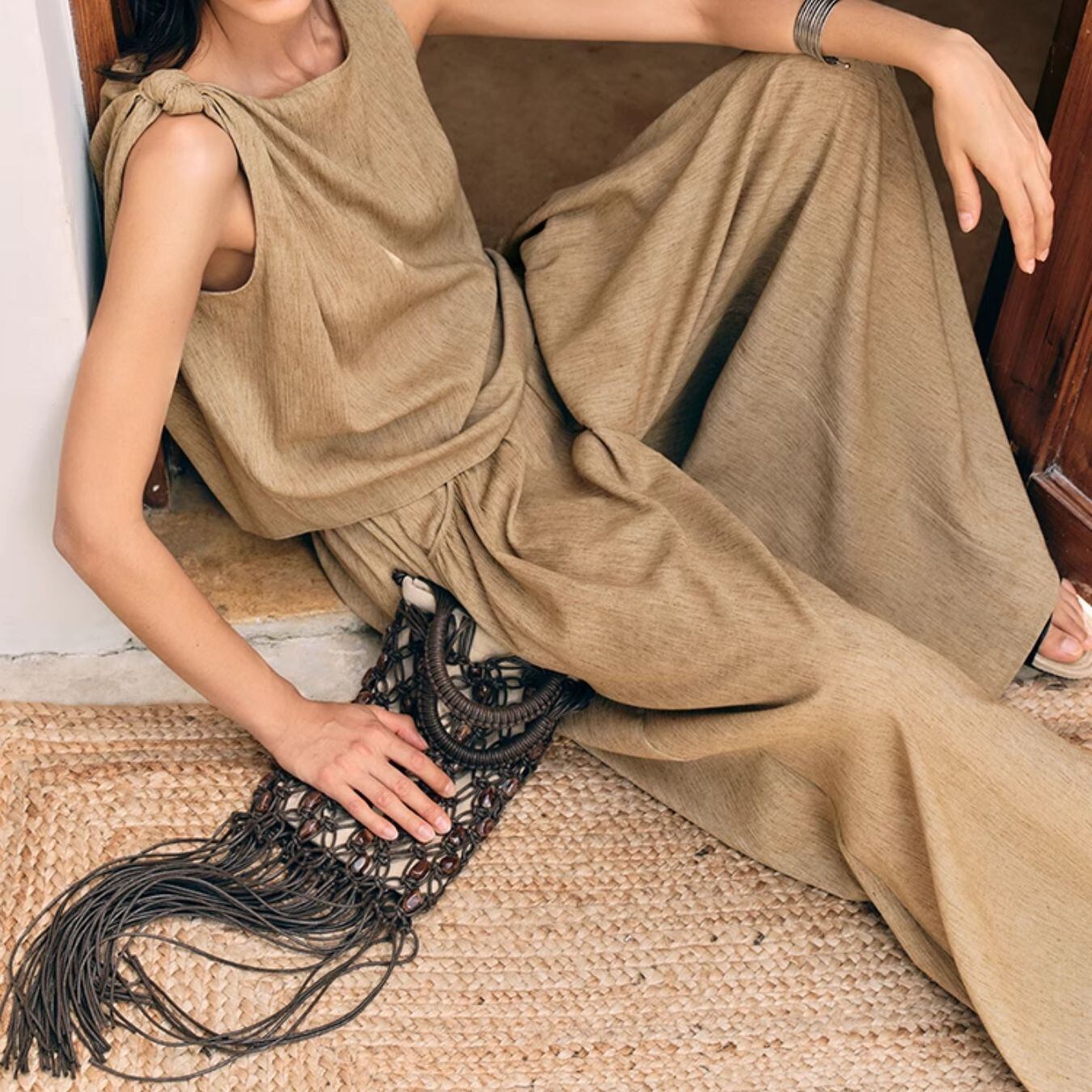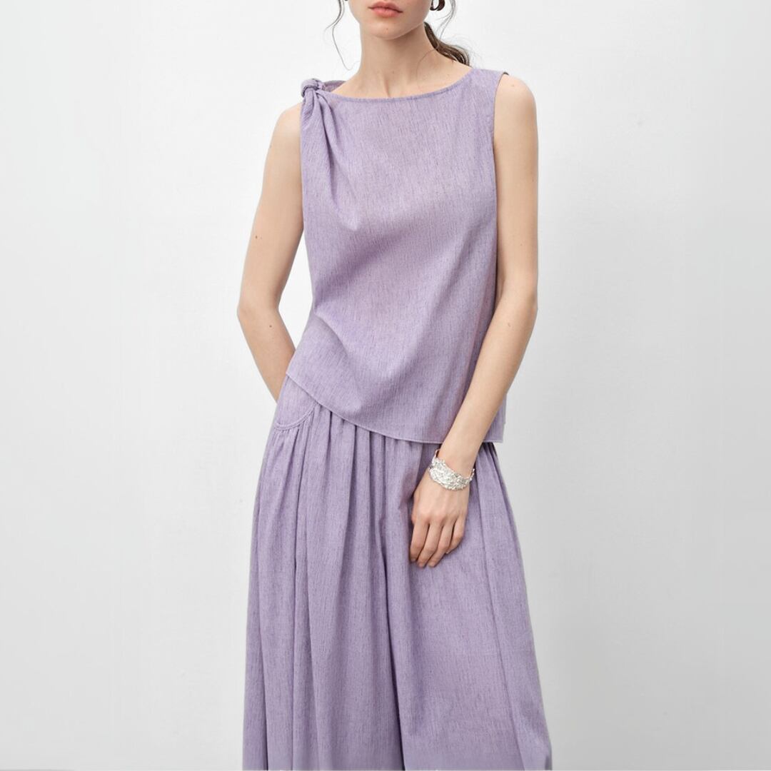 片側の肩に結び目をあしらったアシンメトリーデザインのトップスと、