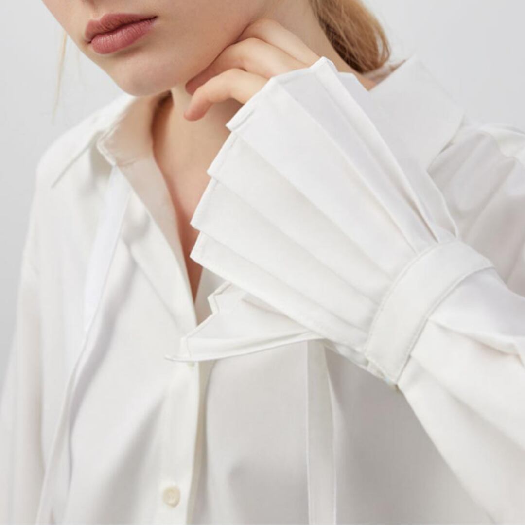 優美なプリーツカフスとリボンタイが印象的な上品なブラウス。