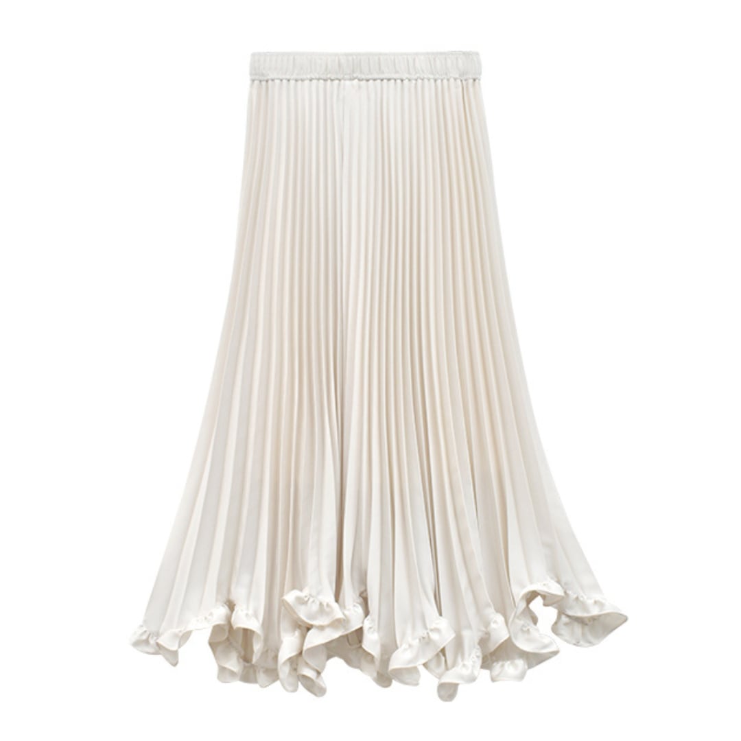 繊細なプリーツと波打つフリルが映えるロングスカート。