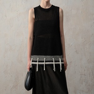 軽やかなメッシュ編みと、裾にあしらわれたフリンジディテールが目を引くノースリーブトップ。