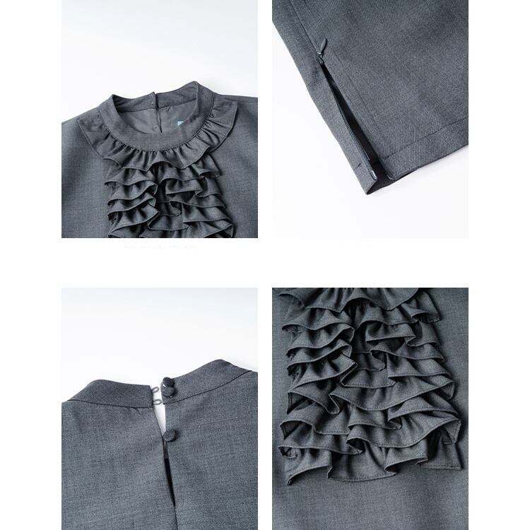 胸元の繊細な多層フリルが印象的な、上品なグレーのセットアップ。