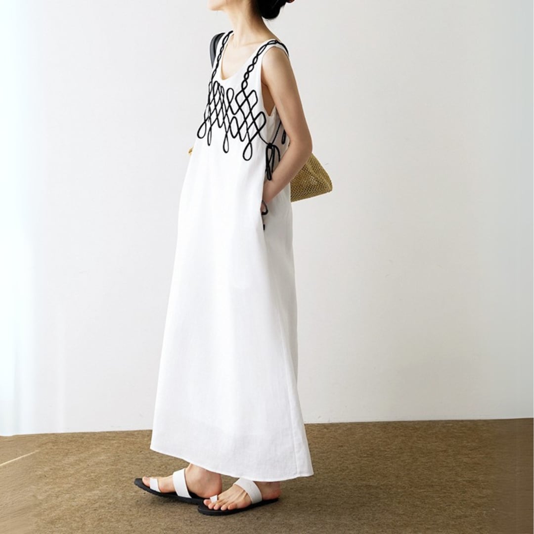 胸元の印象的な黒いコードデザインが、シンプルな白のワンピースに洗練された個性を与えています。
