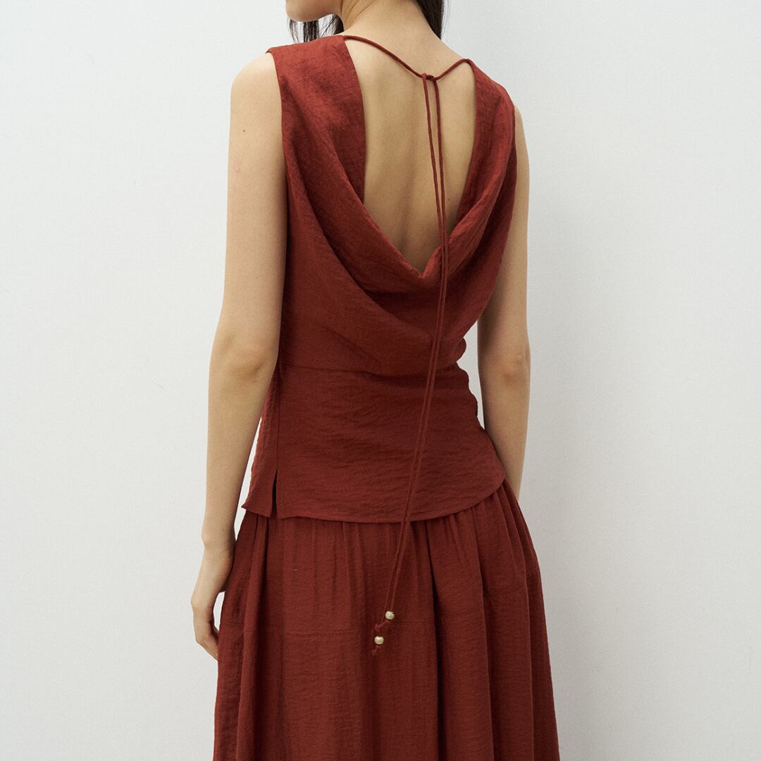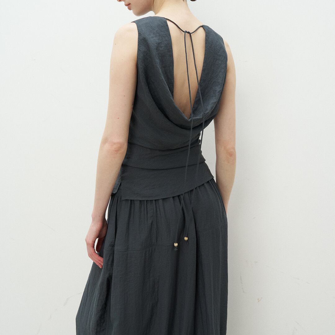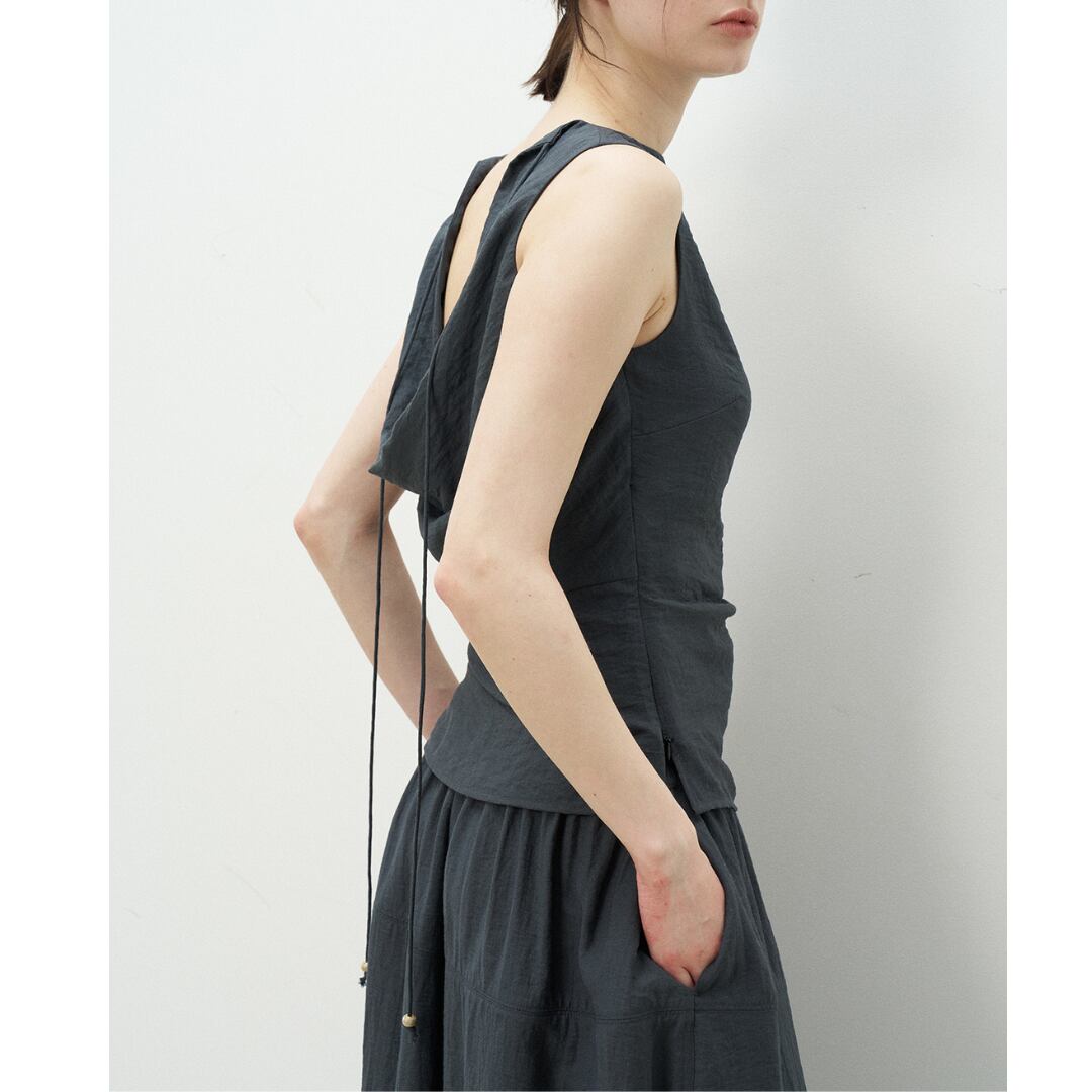 大胆なバックオープンと、紐のアレンジが魅力のセットアップ。