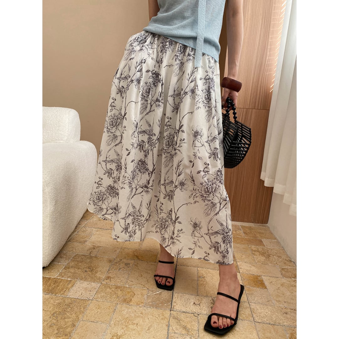 ボタニカルモチーフを配した、アーティな印象のロングスカート。