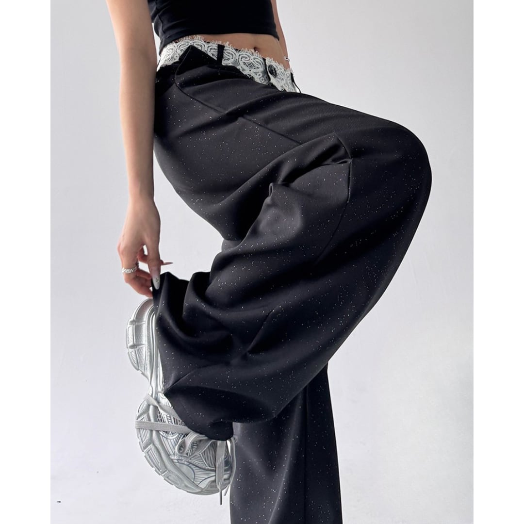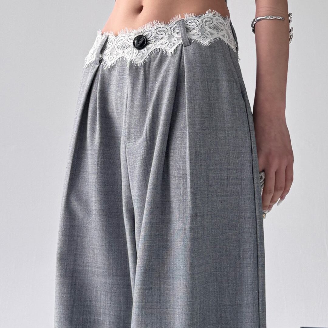 華やかさと端正さが共存する、レースウエストデザインのワイドパンツ。