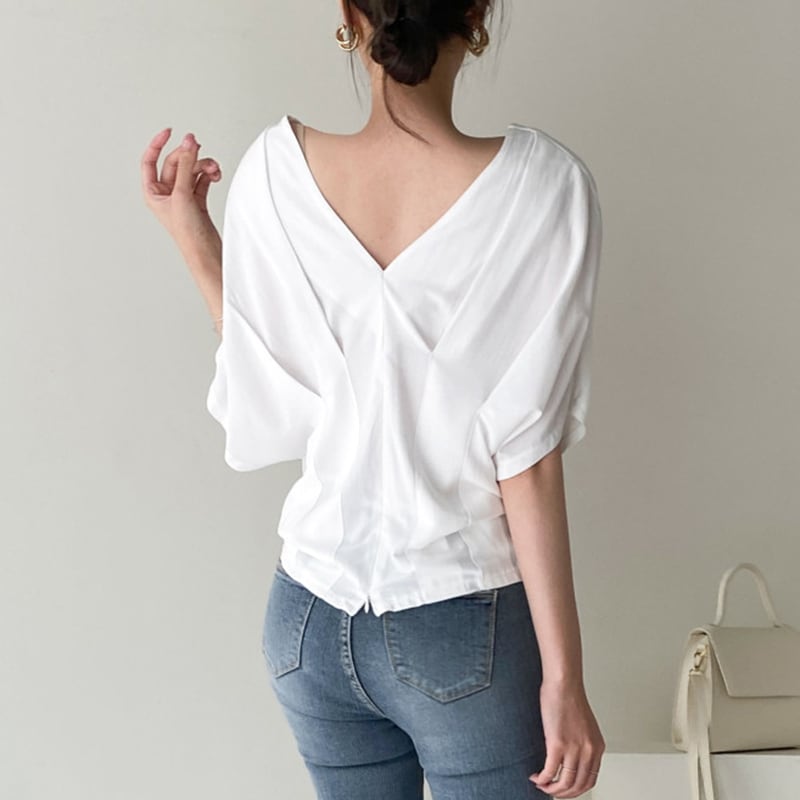 フロントスリットがすっきりとした抜け感を演出するVネックトップス。